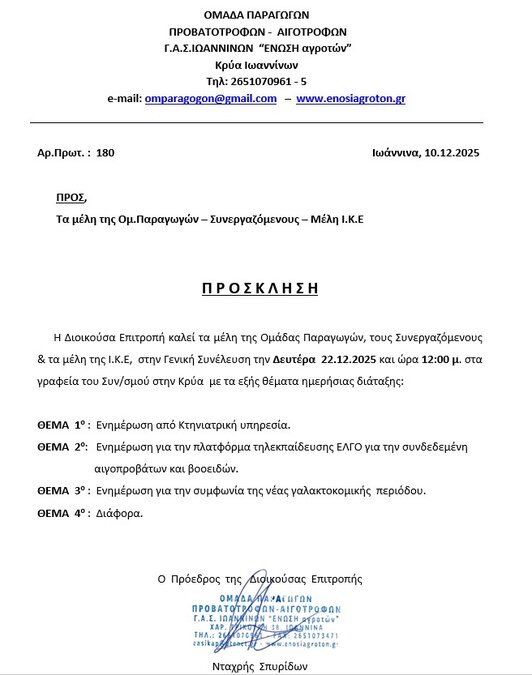 Η Διοικούσα Επιτροπή καλεί τα μέλη της Oμάδας Παραγωγών, τους Συνεργαζόμενους & τα μέλη της Ι.Κ.Ε,